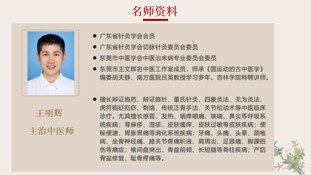 东莞市王文辉名中医工作室成员,师承《圆运动的古中医学》编委胡天静、南方医院吕英教授学习多年。临床治病以“气一元论”为辩证体系,从医多年,拥有扎实的中医基础,内科病多注重脏腑阴阳升降之法,临床辨象,化繁为简。针灸以调气针法、董氏针灸为主;中药用药轻灵,良药而不苦口;正骨手法以龙氏治脊、南粤正骨、澳洲关节松动术为主,手法安全轻巧,调理脊柱及四肢关节等结构性疾病效果显著。