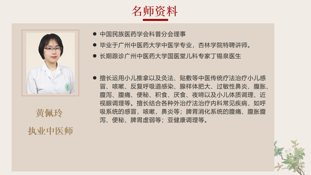 擅长运用小儿推拿以及灸法、贴敷等中医传统疗法治疗小儿感冒、咳嗽、反复呼吸道感染、腺样体肥大、过敏性鼻炎、腹胀、腹泻、腹痛、便秘、积食、厌食、夜啼以及小儿体质调理、近视眼调理等。擅长结合各种外治疗法治疗内科常见疾病,如呼吸系统的感冒,咳嗽,鼻炎等;脾胃消化系统的腹痛、腹胀腹泻、便秘、脾胃虚弱等;亚健康调理等。