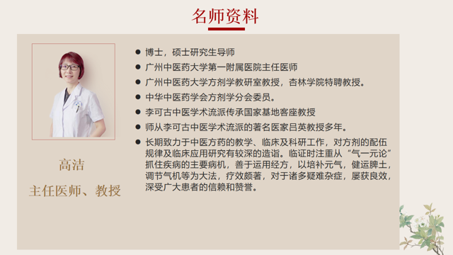 长期致力于中医方药的教学、临床及科研工作,对方剂的配伍规律及临床应用研究有较深的造诣。临证时注重从“气一元论”抓住疾病的主要病机,善于运用经方,以培补元气,健运脾土,调节气机等为大法,疗效颇著,对于诸多疑难杂症,屡获良效,深受广大患者的信赖和赞誉。