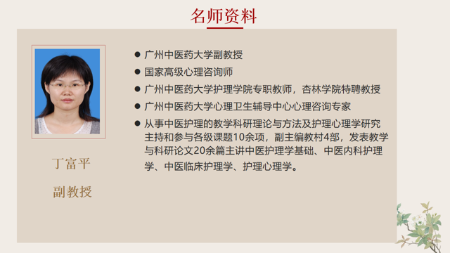 丁富平,女,副教授,中医学硕士,国家高级心理咨询师,广东省普通话测试员,广州中医药大学督导专家,广州中医药大学心理卫生辅导中心心理咨询专家,中医护理学基础、中医内科护理学、中医临床护理学、护理心理学主讲教师。从事中医护理的教学科研理论与方法及护理心理学研究,主持和参与各级课题10余项,副主编教材4部,发表教学与科研论文20余篇。